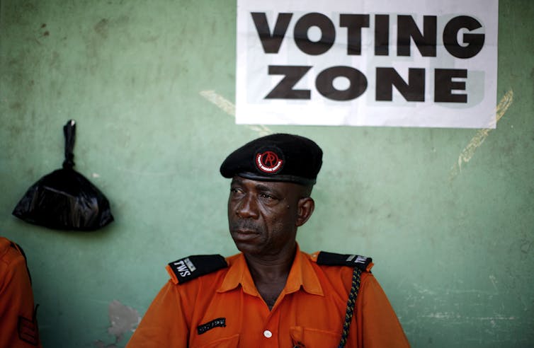 A Nigerian security guard working as an election official sits at a polling station in the main city of Lagos. Reuters/Finbarr O’Reilly